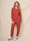 This burnt brick sweatshirt is crafted in a textured waffle knit with a relaxed silhouette and ribbed trim. Finished with subtle shoulder "BONJOUR" embroidery, it brings a casual yet elevated touch to everyday wear.