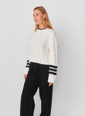 This cozy cable-knit sweater features a textured diamond pattern and ribbed trims for a classic touch, accented with bold striped cuffs and a contrast neckline. Its relaxed, slightly cropped silhouette adds a modern twist to a timeless design.
