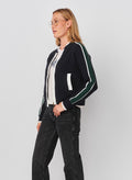 This sporty knit jacket features a zip-front design with contrast trim and bold side stripes for a modern, athletic touch. Ribbed cuffs and hem add structure to its relaxed silhouette, making it a chic layer for casual days.