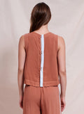 A loose cropped shell tank top with button closures on the back. Soft silky textures for a warm day. Paired with our wide leg pant.
