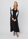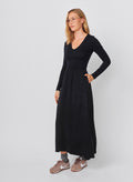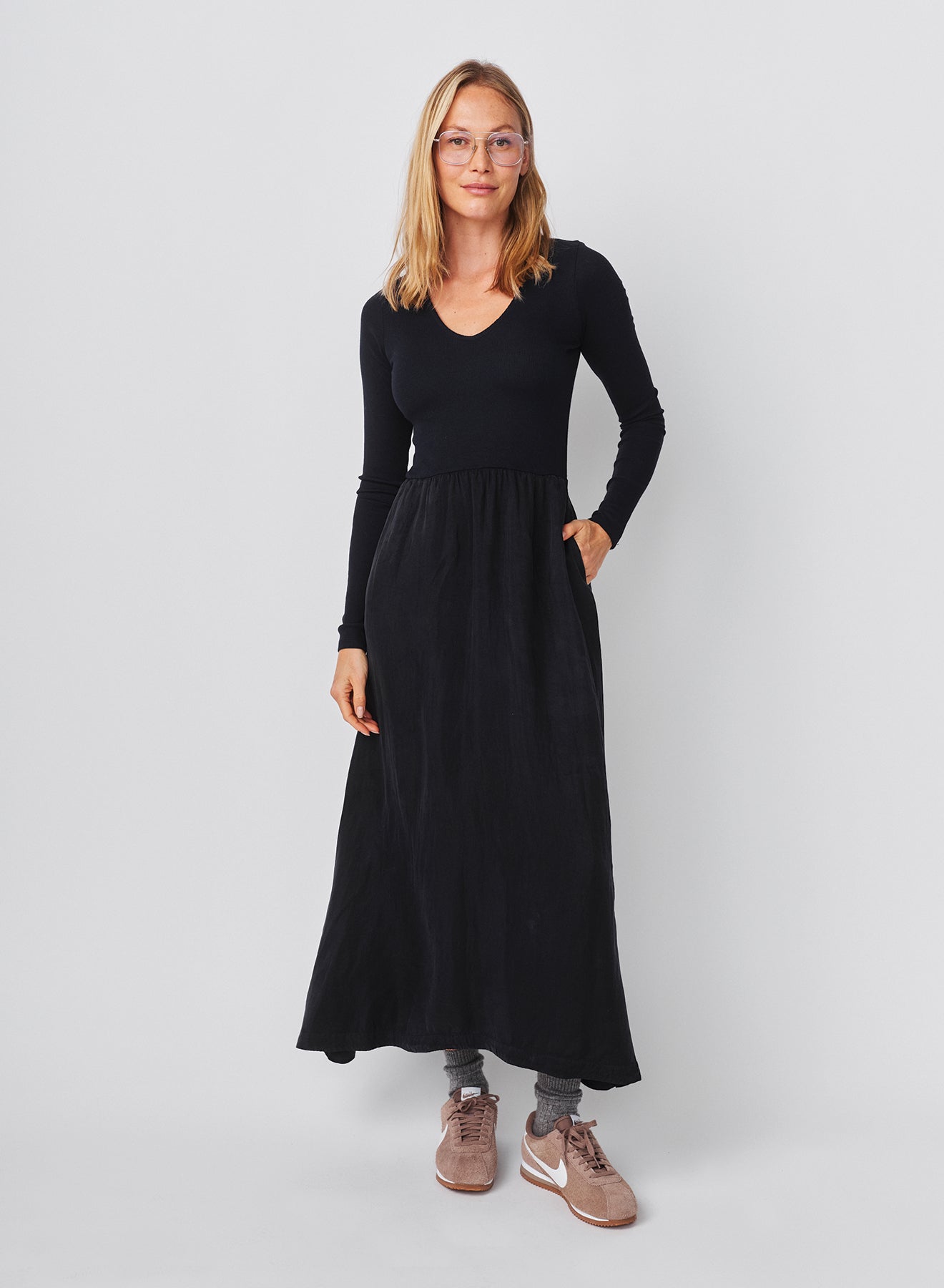 This long-sleeve dress blends a fitted ribbed top with a flowing skirt for an effortlessly feminine silhouette. The deep V-neckline and gathered waist add soft structure, making it perfect for both casual days and cozy evenings.