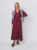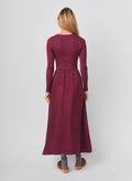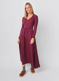 This long-sleeve dress blends a fitted ribbed top with a flowing skirt for an effortlessly feminine silhouette. The deep V-neckline and gathered waist add soft structure, making it perfect for both casual days and cozy evenings.