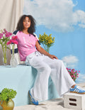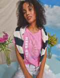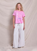 Tres Bien Short Sleeve Boxy Crew Neck Tee with sun graphics on the front in our new Spring color, Azalea.
