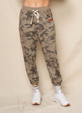 These camo joggers feature a relaxed fit with an elastic drawstring waistband and cuffed ankles. A small rainbow stripe graphic at the hip adds a colorful accent to the classic camouflage print.