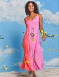 A midi maxi tie back dress with ombre from pink to darker raspberry color with a comfortable feel. A V neck cut at the front with the crossed tie back that's perfect for the heat.