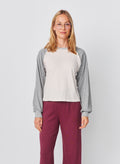 This easy raglan top pairs soft contrast sleeves with playful frayed detailing along the seams. Its relaxed fit and casual charm make it a perfect everyday piece with a touch of French-inspired ease.