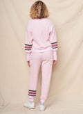 These ballerina pink waffle-knit joggers feature a relaxed fit with a black-and-white striped drawstring waist and ribbed cuffs. A maroon sun emblem at the hip and multicolor stripe detailing at the ankle add a sporty, playful finish.