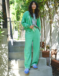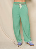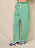These wintergreen joggers feature a relaxed wide-leg fit with side pockets and contrast stitching along the seams. A striped elastic waistband with a natural drawstring adds a sporty, retro-inspired touch.