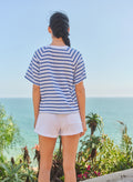 A relaxed, short-sleeve knit top featuring horizontal blue and white stripes, this style has a loose, boxy silhouette with a wide crew neckline and slightly dropped shoulders for an easy, casual drape. Crafted in a lightweight fabric that falls softly over the body, it pairs effortlessly with shorts or denim for a breezy, seaside ready look.
