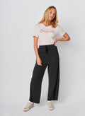 These washed black pants feature a relaxed, straight-leg silhouette with a plush velour side stripe for a touch of sporty sophistication. Designed with an elastic waistband and drawstring tie, they blend everyday comfort with elevated, lounge-ready style.