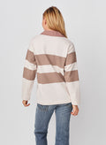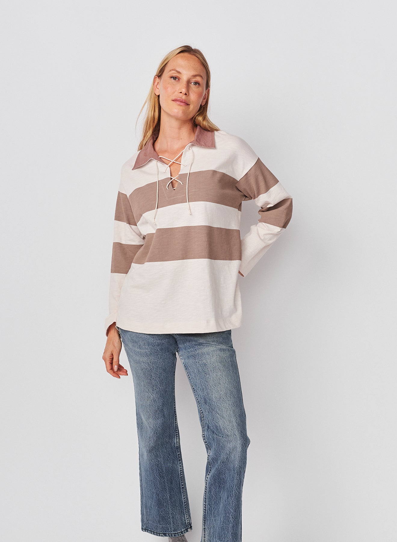 This rugby-style top features bold navy and cream stripes with a lace-up neckline, blending classic sport inspiration with relaxed, coastal ease.