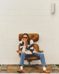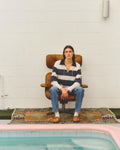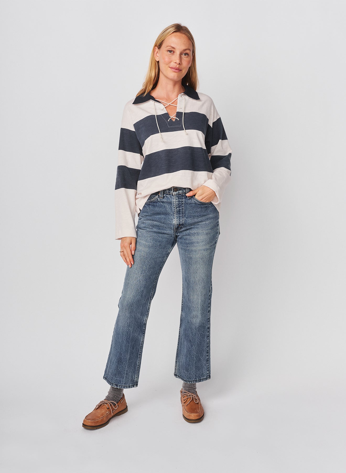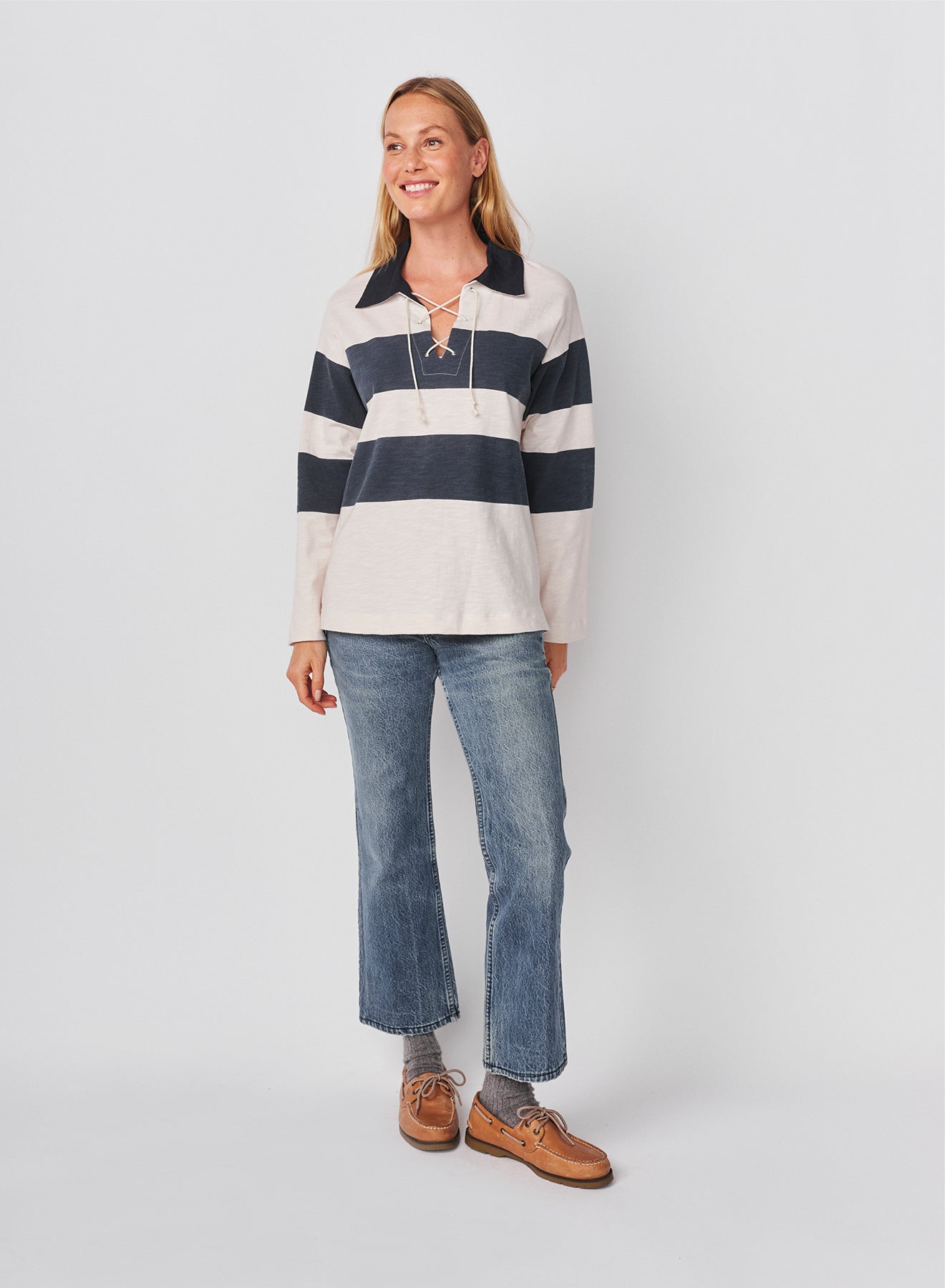 This rugby-style top features bold navy and cream stripes with a lace-up neckline, blending classic sport inspiration with relaxed, coastal ease.