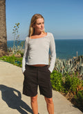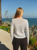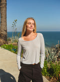 A lightweight long sleeve knit top in a soft, pale sea glass hue, this style features a wide scooped neckline that gently frames the collarbones and a subtly cropped hem that lays right above the waist. Cut with a slim yet easy fit through the body and sleeves, it drapes smoothly for an effortless relaxed silhouette.