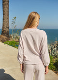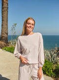 This relaxed long-sleeve top is made from a soft, breathable fabric with a loose silhouette and gently cinched cuffs for an easy, polished feel. Finished in a light oyster hue, it’s an effortless staple that pairs perfectly with matching lounge or track pieces.