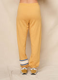 These soft daffodil yellow knit trousers feature a relaxed fit with a black-and-white striped drawstring waist and contrast blue and white stripes at the hem. An embroidered sun motif near the pocket adds a playful finishing touch.