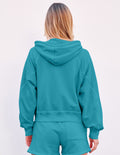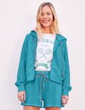 This zip-up hoodie features a relaxed, slightly cropped silhouette with curved seam detailing for a subtly structured look. Designed in soft dusty aqua fabric, it’s finished with oversized striped drawcords tipped in neon coral for a bold contrast against the neutral tone.