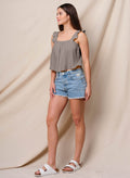 This French-inspired, California-born flutter top features a breezy cropped silhouette with soft ruffled straps for a touch of feminine charm. Its lightweight fabric makes it perfect for effortless, sunny-day styling.