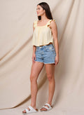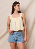 This French-inspired, California-born flutter top features a breezy cropped silhouette with soft ruffled straps for a touch of feminine charm. Its lightweight fabric makes it perfect for effortless, sunny-day styling.