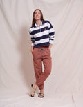 Thick striped johnny collar pullover with a half zip and embroidered palm tree. We styled with our joggers.
