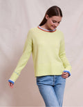 An oversized crew top with tipping and accents of blues and oranges. A perfect crewneck sweater to brighten up your day.