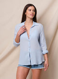This button-up top is crafted from airy double gauze fabric, offering a soft crinkled texture that drapes effortlessly. Detailed with delicate shell buttons, a gently curved hem, and rolled sleeves, it blends laid-back ease with thoughtful finishing touches.