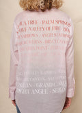 This button-down shirt in ballerina pink features a classic collar and relaxed fit, with clean tailoring in the front. The back showcases a bold typographic print of iconic desert and canyon destinations, adding a unique graphic edge to the timeless silhouette.