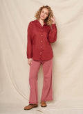 This button-down shirt in deep Tibet red features a classic collar and relaxed fit, with clean tailoring in the front. The back showcases a bold typographic print of iconic desert and canyon destinations, adding a unique graphic edge to the timeless silhouette.
