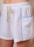 These French-inspired short feature a breezy, relaxed fit with an adjustable drawstring waist and roomy patch pockets. Finished with charming contrast blue stitching, they bring an effortless coastal vibe perfect for sunny days.