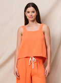 Light and effortlessly breezy, this blaze orange tank top is crafted from soft cotton gauze for a relaxed, airy fit. Featuring wide straps and a clean square neckline, it’s finished with an elegant overlapping back slit that adds movement and a touch of coastal charm.