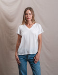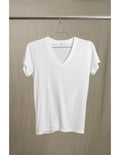 Our V-neck fits exactly like our crew neck except with a mid depth V-neck line. Our goal was to create a fit that was both comfortable and stylish, which you can size up or size down if you prefer a slim or oversized fit.