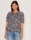 Delicate puff sleeve henley shirt with front button detail and small side slit at the hem.