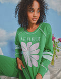 This green raglan sweatshirt features a bold daisy graphic with the phrase “LE FLEUR” front and center, channeling fresh, playful spring energy. With contrast sleeve stripes and exposed stitching details, it’s a cozy, statement-making layer perfect for lounging or casual days out.