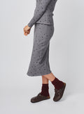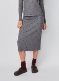 This ribbed pencil skirt pairs comfort with charm, featuring a soft, stretchy knit patterned with scattered star prints. Designed with a flattering, body-skimming silhouette that falls just below the knee, it’s an effortless piece that transitions beautifully from lounge to laid-back outings.