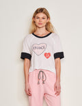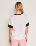 Soft supima slub boyfriend tee with exaggerated contrast cuffs, raglan sleeves and front graphic detail.