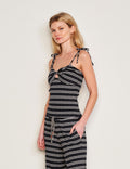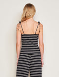 Fitted cami with a twist that creates a keyhole detail and spaghetti straps that tie at the shoulder.