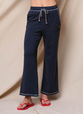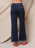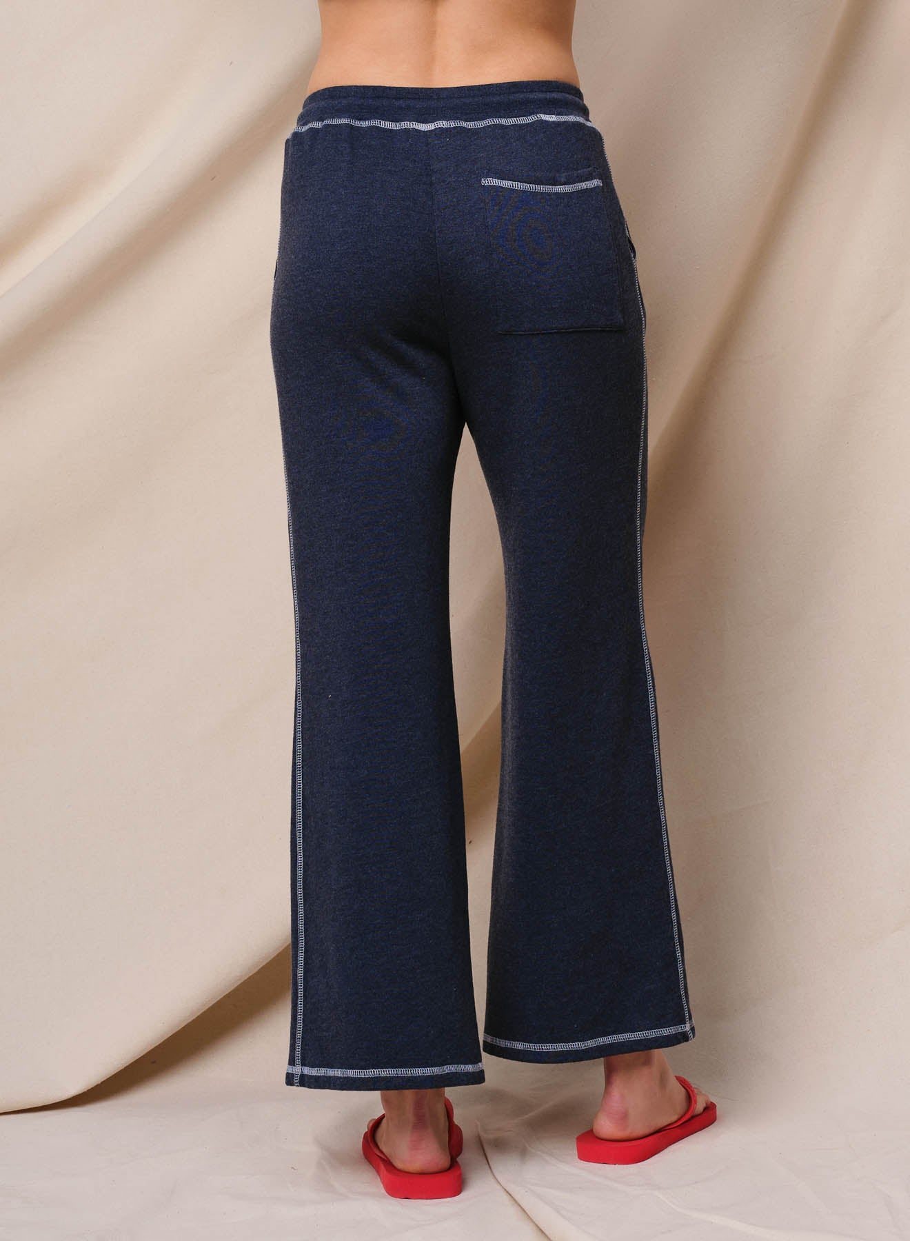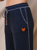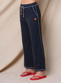 These deep navy lounge trousers offer an effortlessly cool take on comfort, featuring contrast stitching, a wide-leg silhouette, and a bold striped drawstring. Finished with a sweet embroidered heart at the hip, they’re perfect for cozy mornings or laid-back strolls with a hint of playful charm.