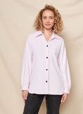 This relaxed ballerina pink colored shacket features a button-front design with a chest pocket and side slits for easy layering. The back is finished with bold graphic text that reads “More Sundays, Plus de Vacances, More Sunsets, Plus d’amour,” adding a playful and carefree touch.
