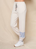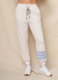 These joggers bring a playful twist to cozy basics with their textured waffle knit, contrast rope drawstring, and bold blue stripes at the cuff. Effortlessly cool yet comfy, they channel that French-meets-California vibe—perfect for lounging or strolling seaside.