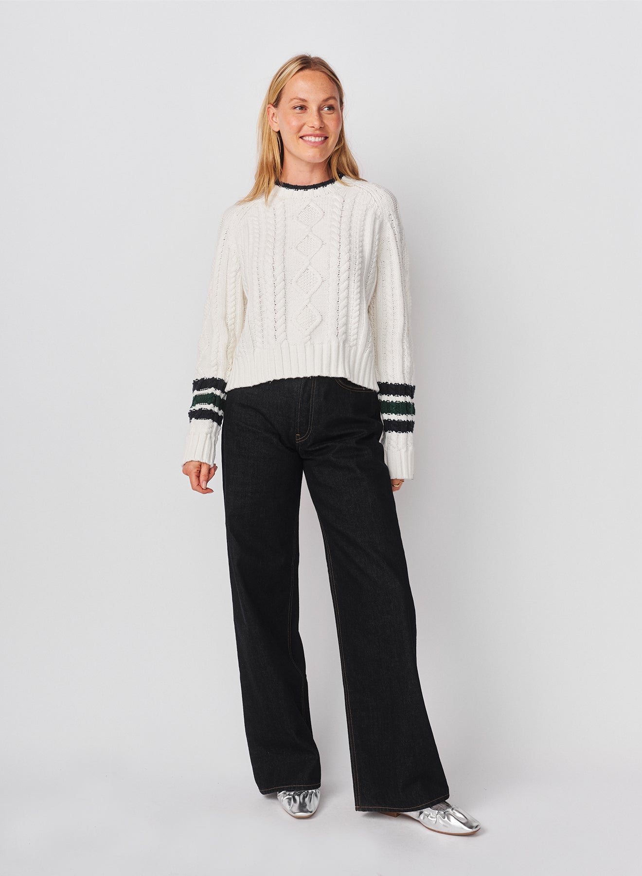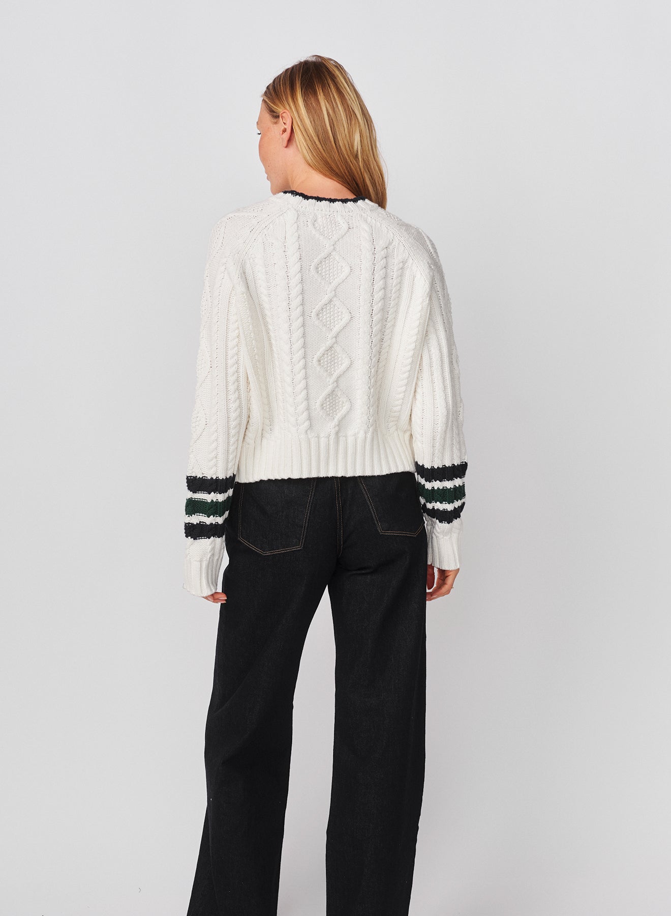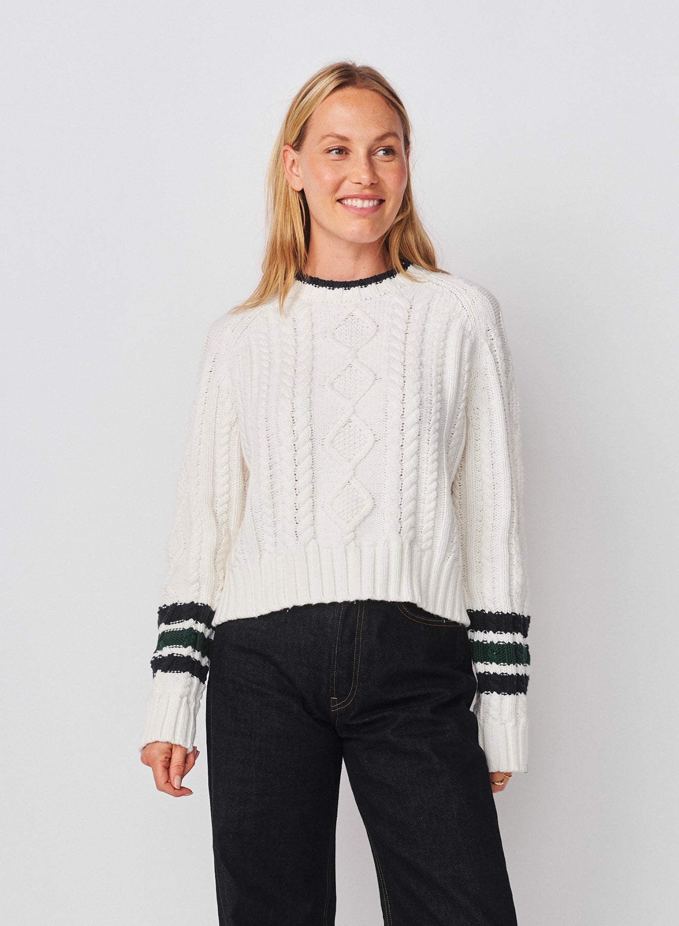 This cozy cable-knit sweater features a textured diamond pattern and ribbed trims for a classic touch, accented with bold striped cuffs and a contrast neckline. Its relaxed, slightly cropped silhouette adds a modern twist to a timeless design.