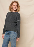 This washed black sweater features a relaxed fit with a subtle crew neckline and ribbed trim at the cuffs and hem. Delicate contrast stitching along the upper sleeves adds a touch of understated detail.