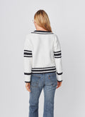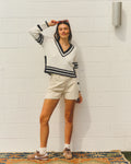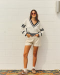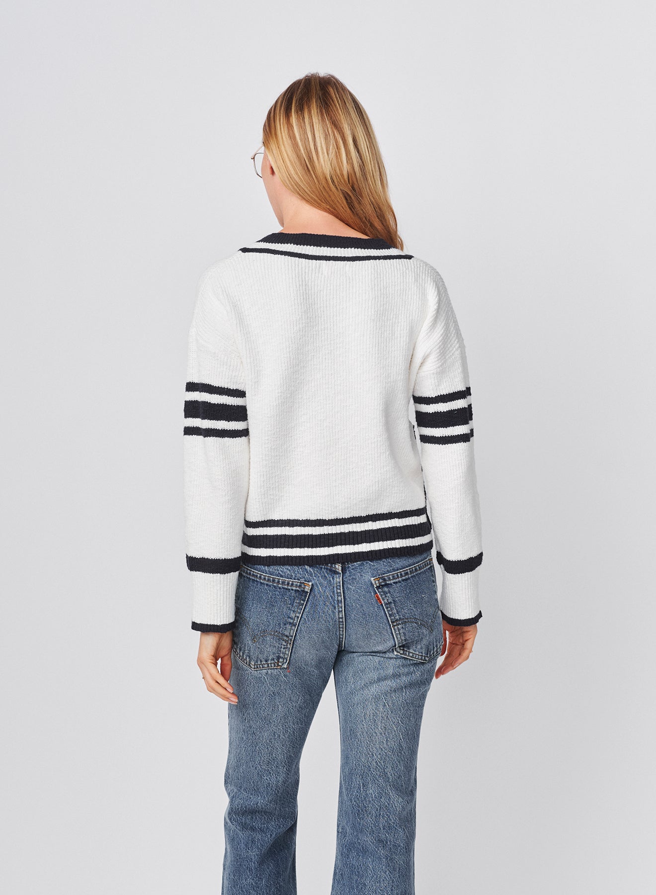 This sporty-chic sweater features a deep V-neckline with bold contrast stripes and matching stripe details along the sleeves and hem. A relaxed fit and varsity-inspired design give it an effortlessly cool, coastal vibe perfect for everyday wear.