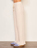 Wide leg pull on drawstring pant with side pockets and back pocket. Pockets have raw edge detail.