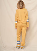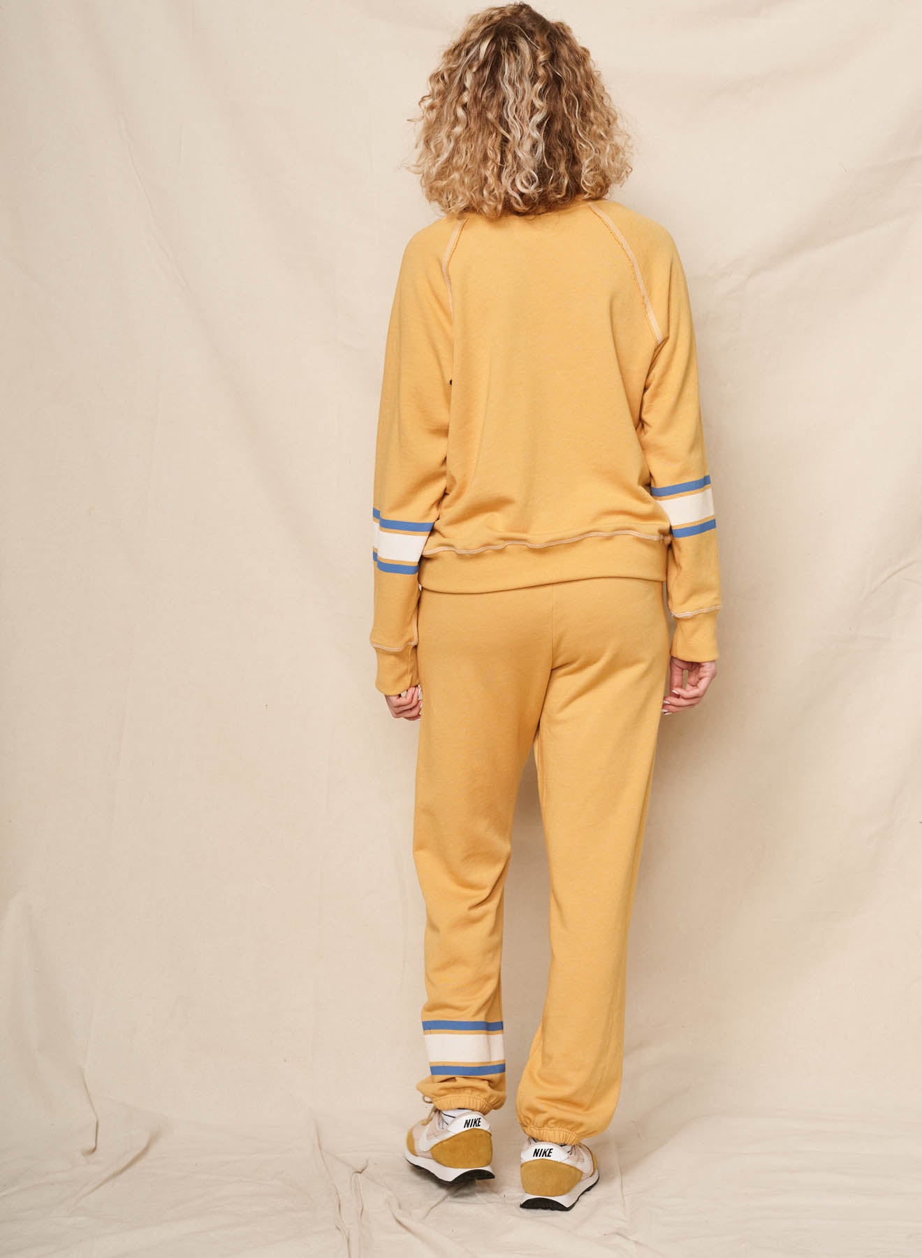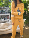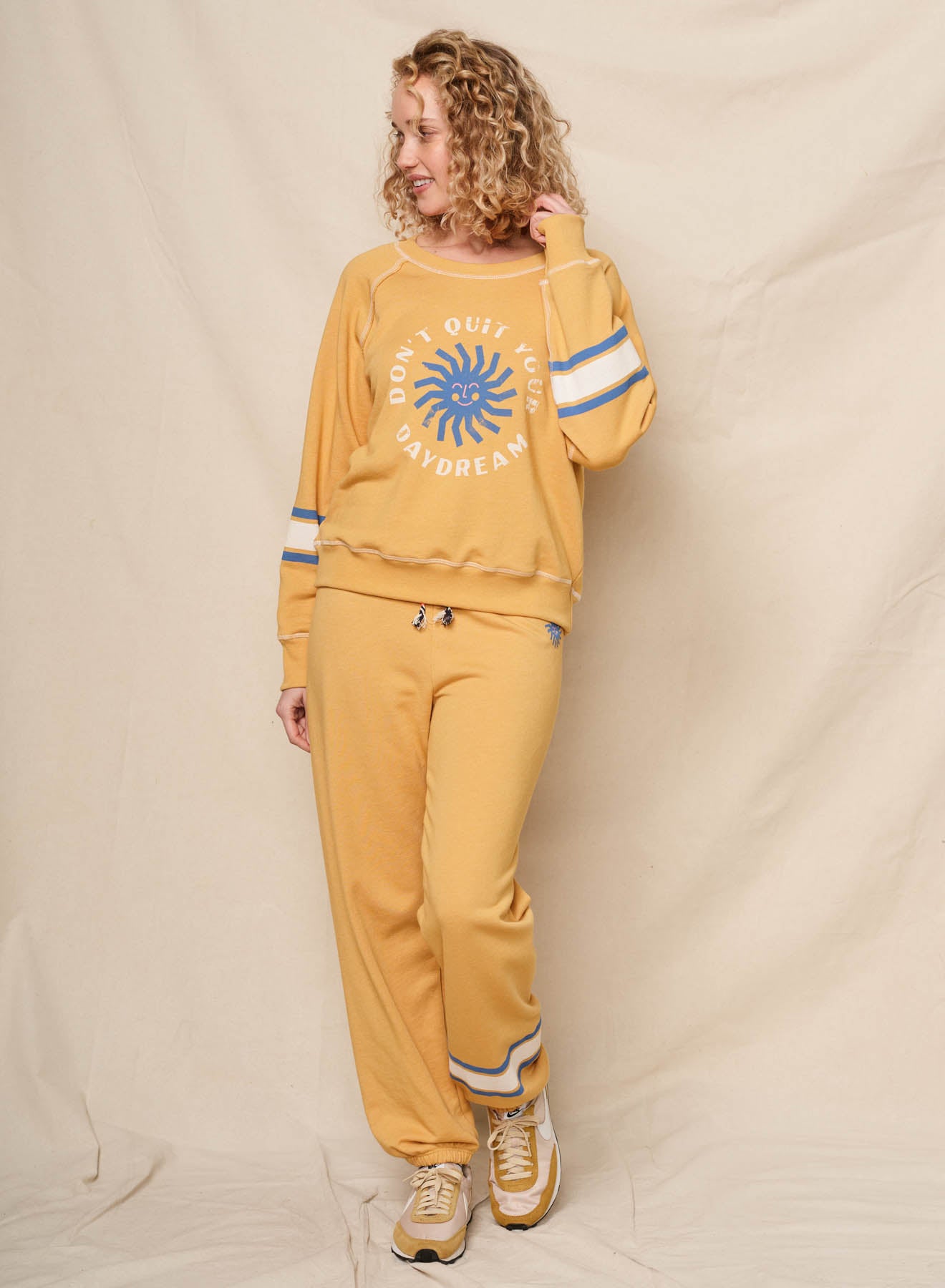 This daffodil yellow sweatshirt features a playful maroon sun graphic with the phrase “Don’t Quit Your Daydream” in gold lettering. Blue and white double stripes on the sleeves add a sporty, retro-inspired touch.