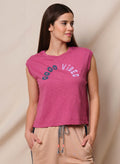 Bright and carefree, this cranberry-hued tee brings West Coast energy with a playful "Good Vibes" graphic and vintage varsity-inspired font. The soft, sun-washed fabric and relaxed fit make it a must-have for golden hour adventures and casual-chic styling.