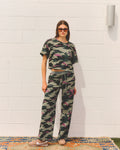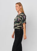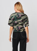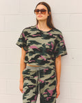 This cropped tee features a bold camo print in earthy green and muted purple tones, giving it a modern twist on a classic pattern. Its relaxed fit and soft knit make it an effortless statement piece for laid-back, everyday style.