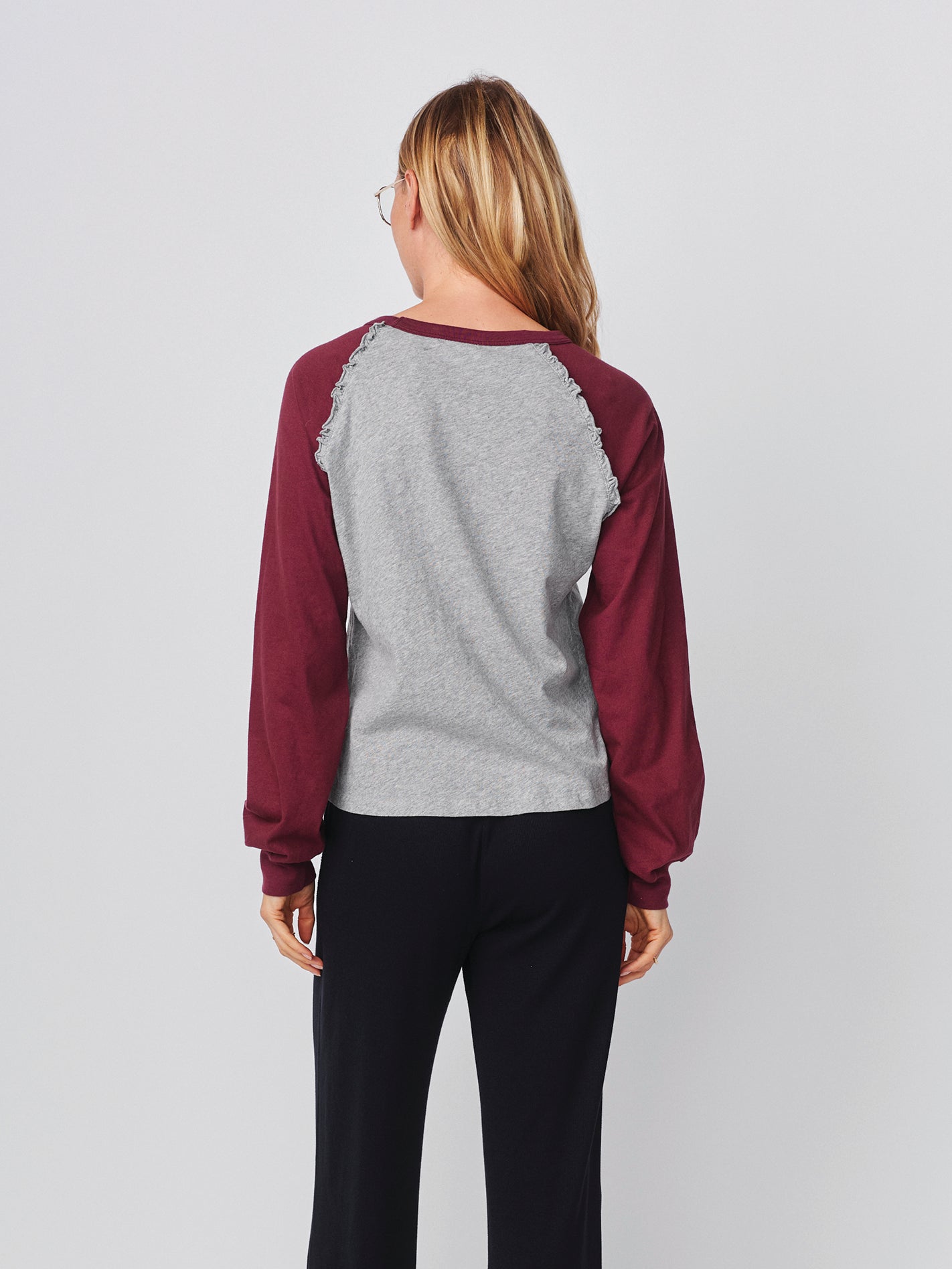 This relaxed raglan top blends sporty and feminine with its soft heather body and contrast wine-colored sleeves. Subtle frayed seam details add texture and a lived-in charm that feels effortlessly casual and chic.