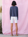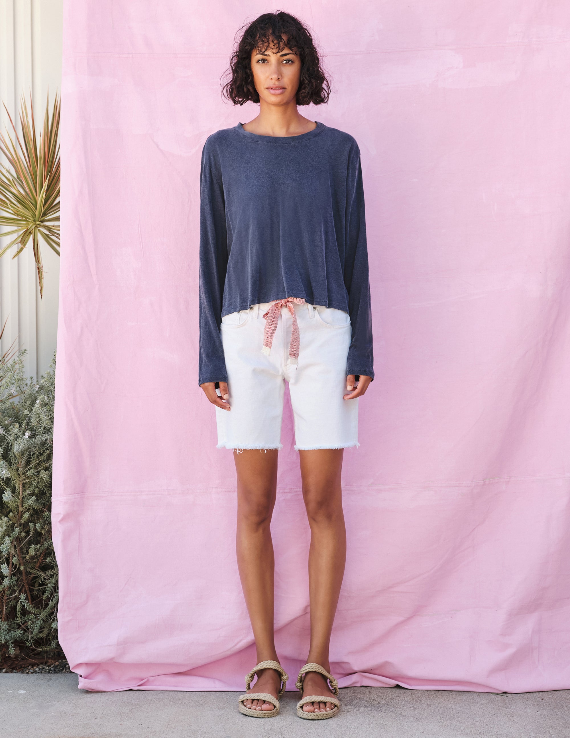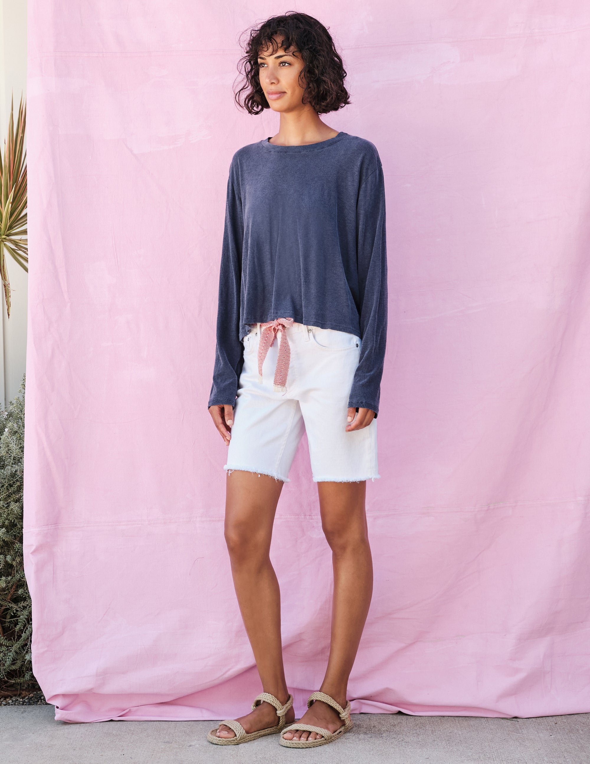 This style is the perfect essential for days when you're looking for the feel of a lightweight t-shirt with the coverage of a long sleeve— a piece that fills the pivotal spot of everyday basic and classic base layer for elevated ensembles. Boxy fit and hits right above the waist band.