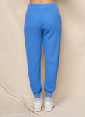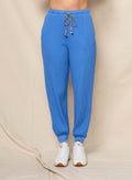 These joggers in lagoon blue feature a cozy waffle knit texture with a relaxed fit and tapered leg. Designed with an elastic waistband and striped rope drawstring, they balance comfort with a playful touch.