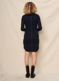 This deep navy colored dress features a sleek, fitted silhouette with a mock neck and long sleeves. Its simple, minimalist design makes it versatile for both casual and elevated styling.