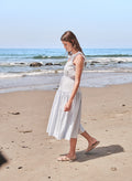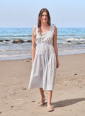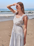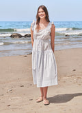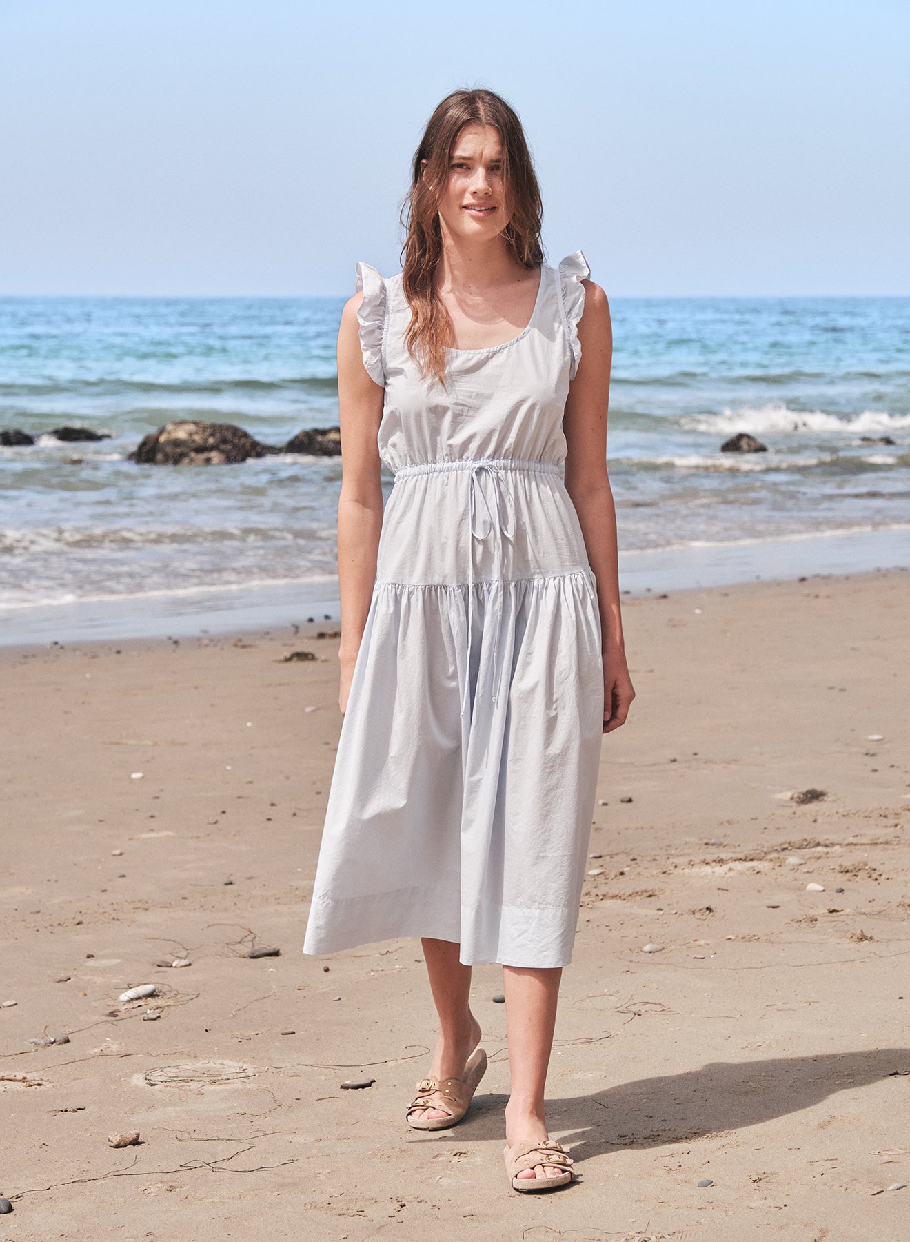 A light, airy midi dress in a soft pale blue features a scoop neckline, flutter ruffle straps, and a drawstring waist that cinches above a full, tiered skirt. The crisp cotton poplin fabric and relaxed, ankle-skimming silhouette give it an easy, romantic feel that’s perfect for warm beach days.